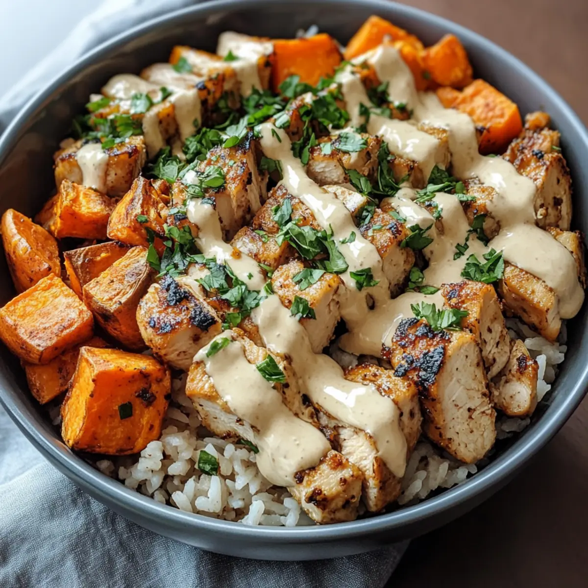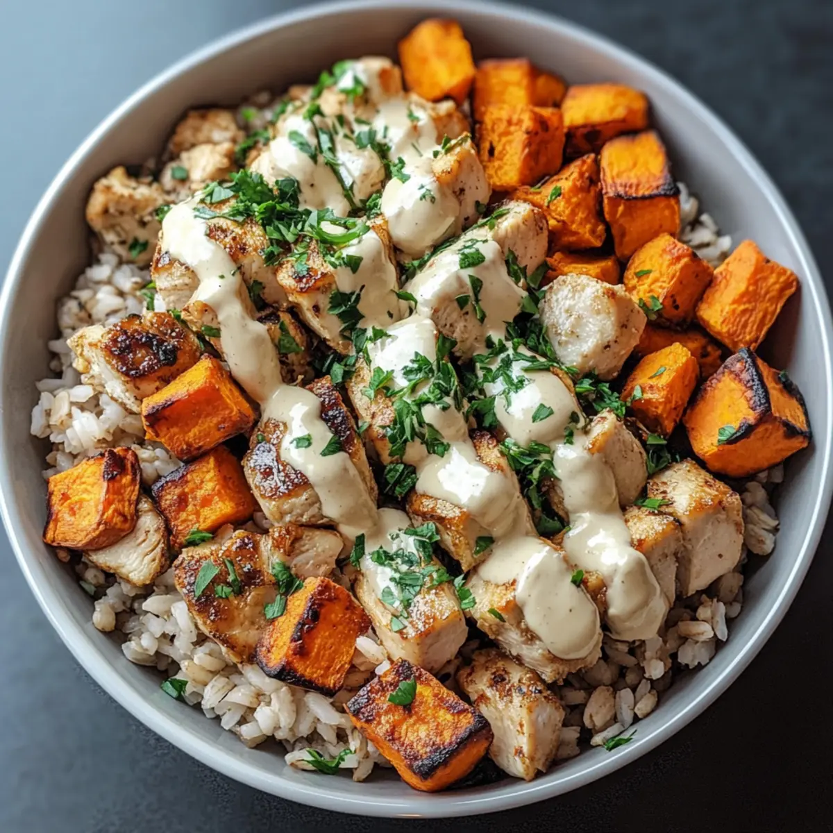 6. Monte os bowls começando com o arroz integral, seguido pelas batatas-doces e o frango, finalizando com o molho de tahine.