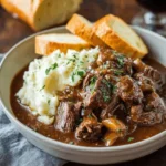 Sirva a carne em cima de uma cama de purê de batata quentinho, com o molho por cima, e acompanhe com fatias de pão de alho. Essa combinação é perfeita para um jantar aconchegante.