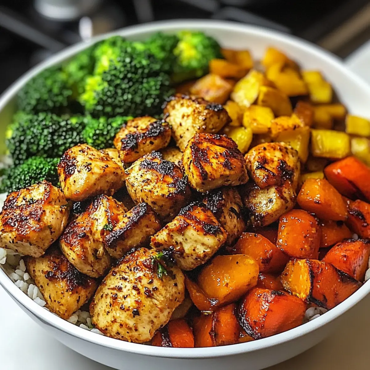 Variações dos Bowl de Frango Picante e Legumes Assados
