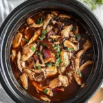 - Retorne o frango picado para a panela lenta e misture tudo. Deixe cozinhar por mais 5–10 minutos até o molho engrossar.