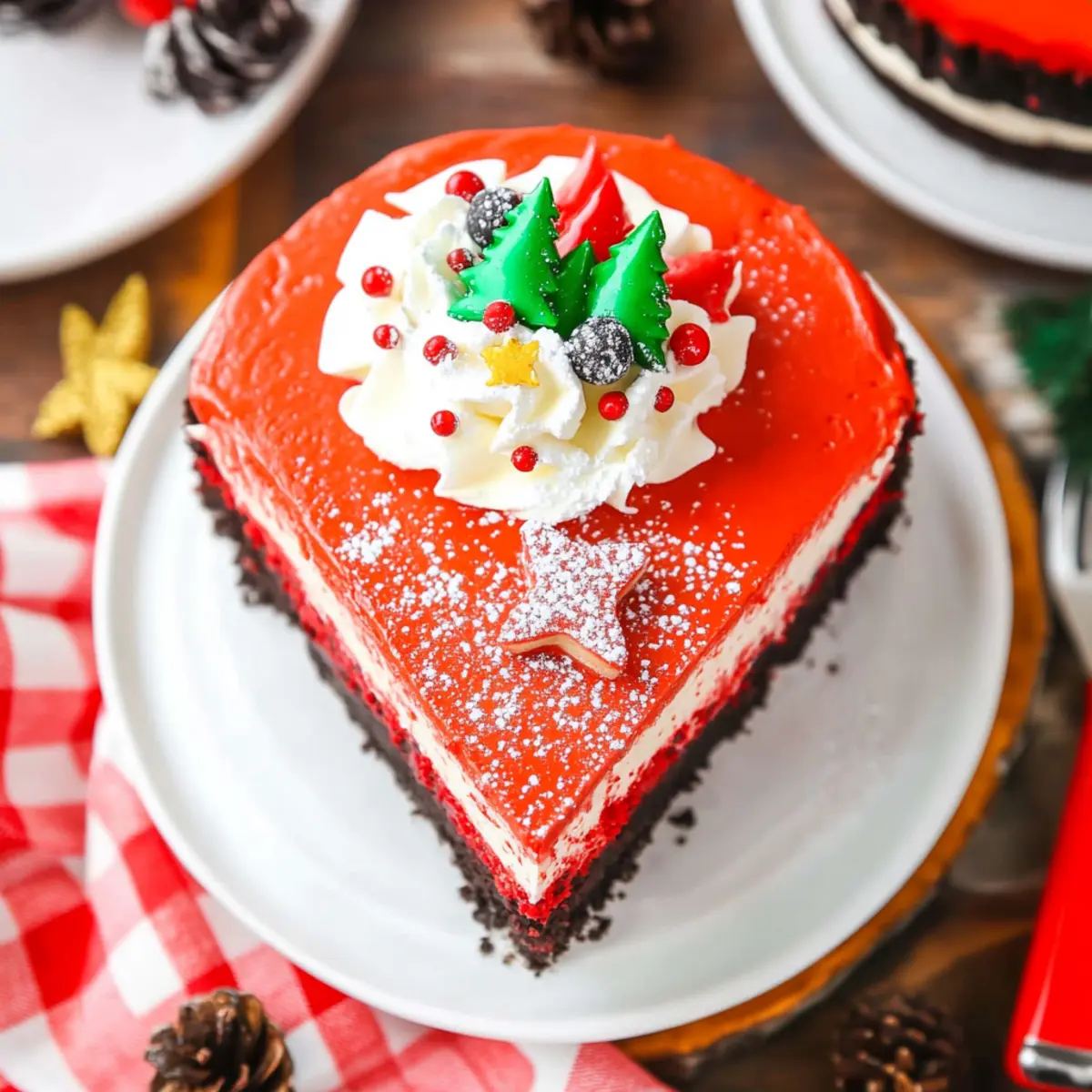 8. Finalizar e Servir: Antes de servir, decore com creme batido, mini biscoitos Oreo e granulados de Natal. Corte em fatias e aproveite!